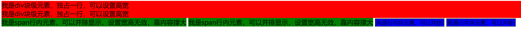 <span>我是span行内元素,可以并排显示,设置宽高无效,靠内容撑大</span>